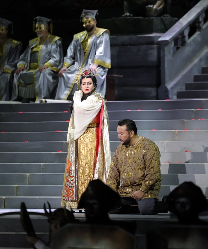 Эту постановку без финала значительно позже казанской и минской премьер рецензенту впервые и довелось увидеть в Казани. Но на сей раз на форуме постановка была показана с классическим финалом Франко Альфано, завершившим оперу по оставшимся наброскам Пуччини. «По просьбам трудящихся» Михаилом Панджавидзе финал был доставлен, а когда это произошло, в сущности, не так уж и важно. Важно, что «Турандот» Пуччини с финалом Альфано идет в Большом театре Беларуси уже давно. В сравнении с Казанью минская также абсолютно классическая, традиционная постановка поражает еще большей масштабностью и монументальностью. Она поистине грандиозна, и это спектакль подлинно большого стиля!