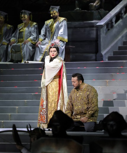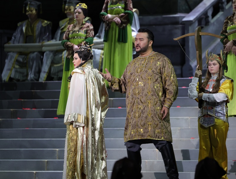 На прогоне названный «квартет» пел практически в полный голос, и казалось, что «всё недопетое» Еленой Михайленко на прогоне, должно прозвучать на спектакле. Но чуда не произошло: некогда мощное звучание певицы удручающе «просело» и в выходной арии, и в сцене загадок, и в финальном дуэте. Вполне зачетно, но шаблонно и холодно, без искры согревающего душу тепла, в партии Лю выступила Елизавета Кулагина. Абсолютно зачетно, на должном артистическом кураже, эпизоды партии Тимура провел Андрей Валентий.