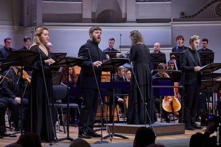 Среди вокалистов традиционно выделяют тенора, исполняющего партию (речитативы) Евангелиста, но есть и певцы-солисты (сопрано, альт, тенор и бас), занятые в речитативах, ариях и ансамблях. Из последних в аспекте прозвучавших частей цикла речь можно вести о дуэте сопрано и баса (часть 3) и о терцете сопрано, альта и тенора (часть 5). В обсуждаемый вечер состав солистов сложился следующий: Елене Гвритишвили (сопрано), Иван Бородулин (контратенор), Михаил Нор (тенор), Игорь Подоплелов (бас-баритон). Как видим, тройка мужских голосов нам уже знакома по проекту «Страстей по Брокесу» Генделя, а Михаил Нор на этот раз взял на себя как партию Евангелиста, так и партию поющего тенора.