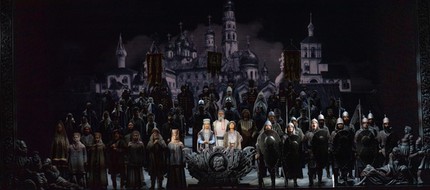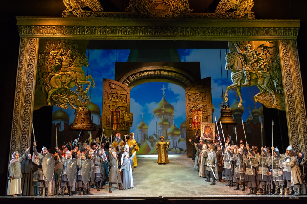 Отечественная «героико-патриотическая» опера Глинки в четырех актах с эпилогом теперь схлопнулась в два акта с прологом и эпилогом. Именно в прологе, которого в этой опере нет, на хоровой интродукции первого оригинального акта, что обращена к «святой Руси» и русской ментальности, впервые на сцене и возникает монументальная рама для парадной открытки. По ходу развития сюжета она модифицируется, но так или иначе всё равно присутствует, ибо в нее загнано то, что осталось от оригинального замысла Глинки.