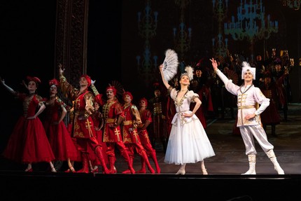 Роль балетмейстера взяла на себя Надежда Калинина, и что касается польского акта, то ее вполне традиционное решение этого действа никаких вопросов не вызывает. Но ритмические подтанцовки хора и миманса – иногда с междометными «охами» и «ахами» – при разводной статике мизансцен то и дело создают в массовых эпизодах эффект развесистой театральной клюквы…