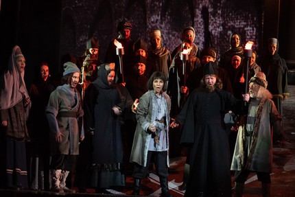 Не столько важен сам текст, а то, в условиях какой постановки и, главное, как этот текст поется на сцене. И в этом смысле проект оказался в надежных профессиональных руках музыкального руководителя Андрея Аниханова, хотя партитура досталась ему как странный подарок от режиссера. Хормейстером постановки стал главный хормейстер театра Юрий Карпов, и услышанное на спектакле 24 февраля смогло убедить как тонким и чутким оркестровым аккомпанементом, так и ярким звучанием хоровых страниц.