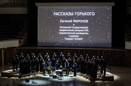 Моноспектакль Евгения Миронова «Рассказы Горького» с участием Московского государственного академического камерного хора (Хор Минина), прошедший в Зале Зарядье в 157-ю годовщину писателя и драматурга, 28 марта, можно считать условной премьерой. Первый показ состоялся семь месяцев назад на фестивале «Горький +» на открытой площадке Парка Горького, — и вполне естественно, что в подобных случаях возникает «поправка на открытый воздух». Очевидно, лишь филармонические условия дают возможность по-настоящему оценить подобный продукт.
