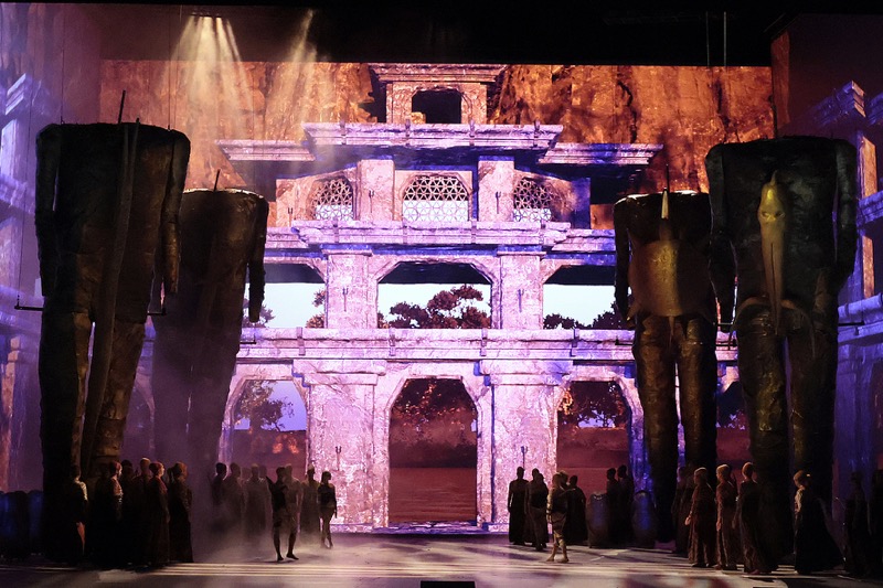 Умиротворяющая зрелищность, подернутая дымкой древнего предания, достигается за счет универсально модифицируемых элементов сценографии, а суперпозиция объемных элементов и виртуально-проекционных образов, трансформирующихся и возникающих на трех сторонах сценической коробки – на центральном заднике и боковых флангах, – как раз и создает мощнейшие 3D-ассоциации. «Строительные материалы» вроде бы одни и те же, но антураж каждой новой картины, каждой новой части цикла не повторяется. Сценическое пространство сказки-мифа покоится на «трех китах» – объемном «мегалитическом декоре» вкупе с функциональной сюжетной атрибутикой (это раз), искусно поставленном свете, о чём уже шла речь выше (это два), и видеопроекционной компьютерной графике (это три).