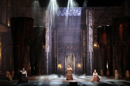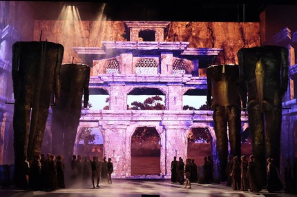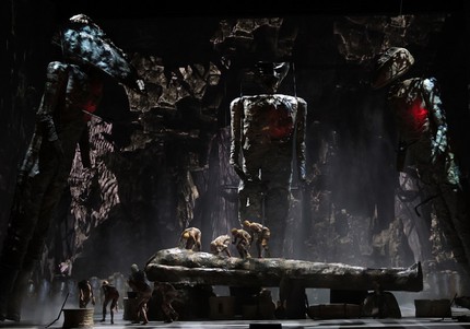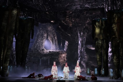 Поклонники «Властелина колец» сразу вспомнили бы о чудесных сильмариллах и палантирах, заложенных в фундамент мифологии Толкина, ведь каменные идолы этой постановки являют собой прочное основание монументального вагнеровского эпоса. В вечном мире камней существуют люди, боги, герои, валькирии, нибелунги, великаны, вещие норны, дочери Рейна (рейнские русалки), лесные обитатели и даже один жадный и глупый великан, оборачивающийся змеем-драконом. Ничего лишнего, никаких бытовых деталей в этой постановке нет – всё поставлено на службу легенде-притче о стремлении к власти над миром и гибельной силе золота (золота Рейна, скованного в кольцо и дающего эту власть).