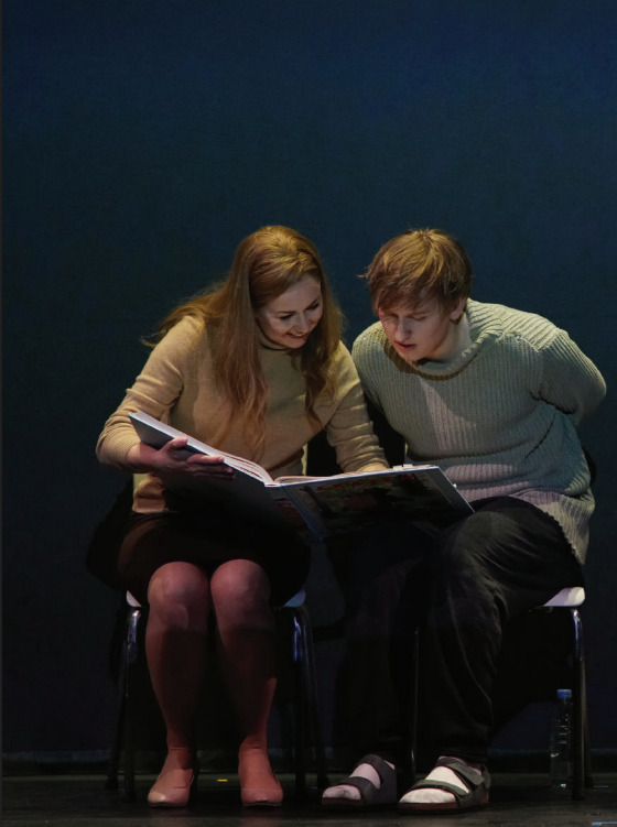 Для этих целей основой визуальной программы спектакля становится документальный фильм Любови Аркус о судьбе мальчика-аутиста «Антон тут рядом» (2012). Из рисунков главного героя фильма вырастает орнамент ватных костюмов персонажей спектакля (оформитель Елена Зайцева), а тема беззащитности человека с психиатрической патологией идеально вписывается в сюжетную канву оперного либретто, практически не вызывая вопросов к правомерности такого взгляда на происходящее в оригинальном сюжете.