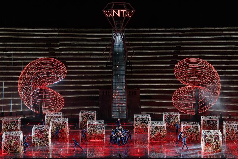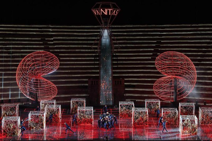 Почти идентичное зрелище за «подписью» Стефано Поды уже показывали ровно два года на той же самой площадке, и звучала музыка того же композитора, а именно Джузеппе Верди, только речь шла об «Аиде». Естественно, пятнадцать тысяч зрителей, заполнивших древний амфитеатр, с нетерпением ждут, что после многочисленных постановок «Набукко», подписанных именами таких режиссеров, как Джанфранко Де Бозио, Хуго Де Ана, Арно Бернар, новый спектакль Стефано Поды — режиссера, сценографа, художника по костюмам, художника по свету и даже хореографа — явит миру что-нибудь оригинальное и вдохновляющее.