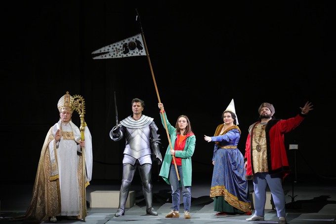 С собой в Минск Георгий Исаакян привел сценографа и художника по костюмам Алексея Трегубова, с которым два года назад на Новой сцене Большого театра в Москве выпустил премьеру оперы Верди «Луиза Миллер». И на явном контрасте трудно даже поверить, что «Луиза Миллер» в Москве и «Орлеанская дева» в Минске – спектакли, созданные одним и тем же тандемом режиссера и художника! Если в Москве их совместные искания «не выстрелили» де-факто вообще, то в Минске результат очевидно превзошел ожидания. Главный плюс этой постановки – то, что ее полистилистика в аспекте и сценографии, и костюмов, и мизансцен вызывает по ходу театрального действа неподдельно живой зрительский интерес, уверенно держит накал нетривиальной интриги.