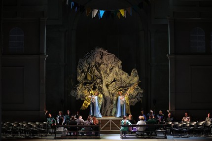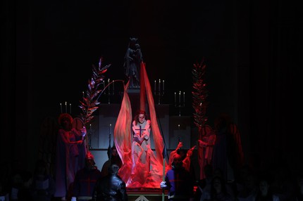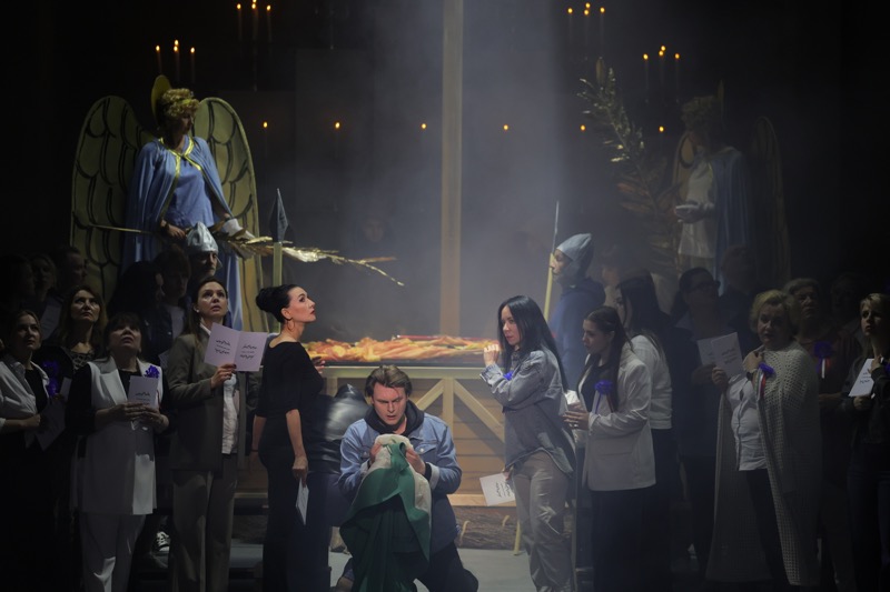 Первый акт предстает грандиозной экспликацией образа Жанны-Иоанны, которую венчают ее развернутая ария предназначения и финал-призыв с хором небесных ангелов, а начало акта – кафедральный собор, где по случаю праздника в честь святой Жанны д’Арк устраивается мистерия из ее жизни, и когда – ко всеобщему изумлению и негодованию статистки, исполняющей роль Иоанны в мистерии, – одна из прихожанок-зрительниц (а это и есть наша Жанна) вдруг неожиданно обращается к собравшимся, как раз вступая в терцете с Тибо, отцом Иоанны, и Раймондом, ее женихом, понимаешь, что с этого момента всё пошло не так. Но этот первый режиссерский «щелчок» производит эффект отрезвляюще глубокий и сильный!
