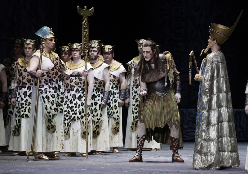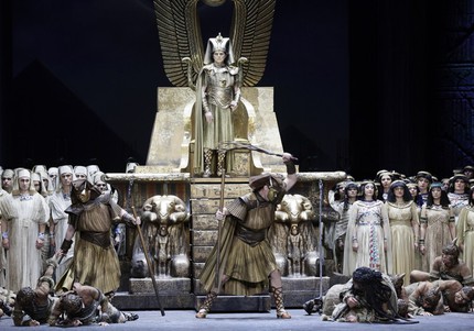 «Мегалитика» сценографии, конечно же, впечатляет, но если вдуматься, то весь восторг достигается, в сущности, весьма скупыми, если не сказать даже аскетичными средствами, но в том-то как раз и заключается профессионализм постановщиков, что их идея бьет точно в цель! Атмосфера дворца и покоев, храма в Мемфисе и площади в Фивах (сцена триумфа), берега Нила и подземелья в финальном акте лишь намечается либо перестановкой каменных «идолов» и привнесением функциональных конструкций, либо за счет видеопроекционной графики, едва уловимой в сравнении с серой коробкой сценографии гигантских размеров, но все четыре акта, разделенные пополам одним антрактом, намеренно зримо сосредоточены внутри этой гигантской коробки, и это осознанный постановочный ход, когда ассоциации с «городком в табакерке» противостоит «мегаполис оперы в пространстве страстей Верди».