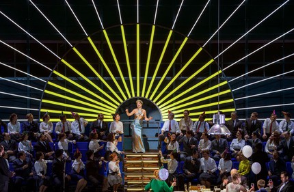 Оформитель спектакля Малгожата Щенсняк адаптировала конструктивные идеи брюссельского спектакля к размерам необъятной сцены Большого фестивального дома и создала пугающе милитаристское пространство без единого намёка на военную атрибутику. Приём «рассеивания» визуального ряда посредством дробной актёрской игры, видеотрансляций, кинофрагментов из итальянской нуар-классики и несметного количества артистов хора и детского миманса вызывает у неподготовленного зрителя растерянность. На сцене столько всего происходит, что вне зависимости от того, где вы сидите, от вашего внимания неизбежно будет что-то ускользать. Но эти многочисленные детали гармонично сплетаются с музыкальной тканью вердиевской партитуры, и спектакль хочется пересматривать и переслушивать снова и снова.