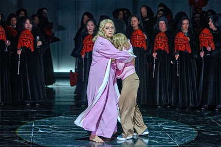 Эпопея Рихарда Вагнера «Кольцо нибелунга» была низведена режиссёром Валентином Шварцем до мыльной оперы ещё в 2022 году, и сегодня трудно поверить, что такая работа продержалась в фестивальной программе целых четыре сезона. Финальная часть тетралогии – «Гибель богов» — в этой интерпретации становится апофеозом профессиональной некомпетентности постановщика. И дело даже не в том, что вдохновлённая форматами домашнего телевидения для домохозяек с двумя извилинами в мозгу эта версия погружает нас в обрывки бытовых мелодрам и семейных психотравм. Дело в том, что и этот формат режиссёр не в состоянии привести в соответствие с элементарными требованиями убедительности и правдоподобности.