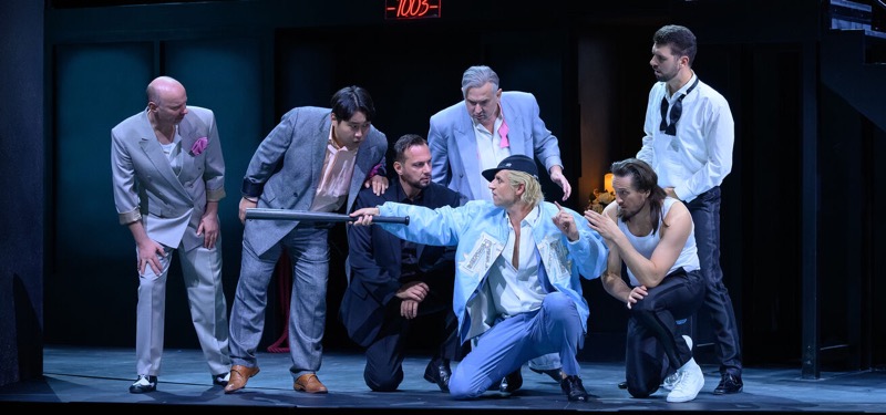 Клубный стиль хрестоматийного приёма полиритмии (об этом подробно в моей лекции) идеально согласуется с выбранным в спектакле А. Лидтке прочтением. Сценография Филиппа Рубнера с вращающейся многоуровневой конструкцией и люминесцентными огнями («Не просто клуб» гласит рекламная надпись на входе в павильон, где разворачивается действие) и костюмные фантазии на тему «лихих 80-х» Йоханны Лакнер формируют базу для главного разоблачения.
