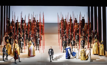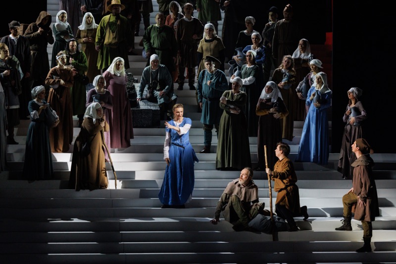 Но до того, как дирижер появляется в оркестре после антракта, Иоанна и Лионель (уже в театральных костюмах) еще перед их схваткой на поле боя устраивают «междусобойчик»-разминку, и в карикатурности подхода к серьезному драматургическому материалу высокой трагедии, рассказанной языком музыки, это убеждает снова. Сцена коронации в Реймсе Карла VII, голубую мантию с лилиями которого, кажется, одолжили у Флорестана XIV из «Спящей красавицы», – еще один ходульный «театр миниатюр»: в нём все участники, в том числе и рыцари, оставляющие на ступенях частокол копий, устремляются по лестнице ввысь к небесам, а сама коронация становится похожа на формальное бракосочетание в загсе.