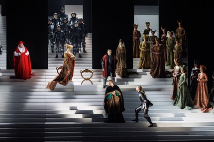 На протяжении всего действа на сцене, точнее – на лестнице почти восьмиметровой высоты с пятьюдесятью четырьмя ступенями, с любовью и благоговением пересчитанными сценографом, видишь лишь сменяющие друг друга шаблонные иллюстрации в эстетике едва ли не студийного театра, не способного в силу его примитивности увлечь зрительский взор. Однообразная иллюстративность без концепции навевает скуку, а историческая проекция на современность (если так, в принципе, можно сказать) проявляется в сугубо иррациональном гротеске, прямо указывающем на то, что всё происходящее на сцене – нелепейший фантом, то есть фантом оперы как таковой вообще и режиссерской оперы в частности.