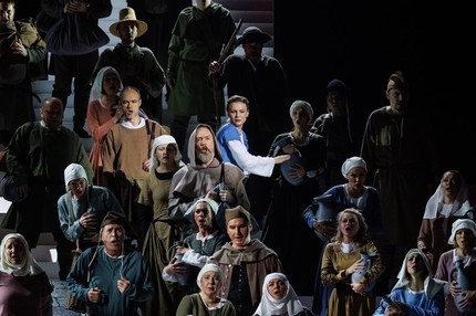 Классическая постановка «Орлеанской девы» Чайковского сегодня есть и в репертуаре Мариинского театра (премьера 2021 года, режиссер – Алексей Степанюк), но на контрасте с Петербургом в Минске родилась постановка в эстетике свободного полета режиссерской оперы (режиссер – Георгий Исаакян), а в Москве – довольно странная постановка, которой, по факту увиденного на показах 28 и 29 ноября, изо всех сил хотелось вписаться в ту же самую эстетику, но удалось вписаться лишь в банальный формат semi-stagе с абсолютно абстрактной «концертной» сценографией и утилитарно стилизованным под эпоху сюжета театральным гардеробом (режиссер – Александр Титель). В результате возник цепной ряд театральных «картинок» по опере, а сама опера локализовалась лишь в «саундтреке».