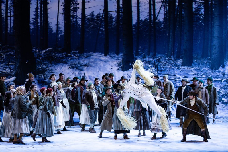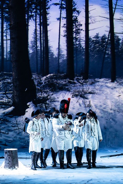 Эта концептуальная сырость закономерно влечёт за собой и мизансценные несуразности. Так, в начале спектакля мы видим брошенного в зимнем лесу младенца, вокруг которого под музыку увертюры долго кружат солдаты с ружьями, направленными на беззащитный кулёк с замерзающим телом. Ничего, кроме отторжения к участникам столь жестокой клоунады, эта сценическая неправдоподобность не вызывает. На подобных глупостях построен весь спектакль.