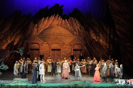 Счастливым оказывается и финал спектакля Августа Эвердинга, с 1978 идущего на сцене Баварской государственной оперы. Режиссёр сознательно создаёт декоративную компиляцию из дошедших до нас оформлений этой партитуры разных лет и превращает взрослую сказку в музейный ликбез. Смотреть этот невероятно нарядный спектакль в красочных декорациях Юргена Розы местами, конечно, скучновато: такие трюковые находки, как сверкающий крокодил с телом змеи, «волшебный огонь» (вспышки канифоли), оживающие кладбищенские статуи и фонтаны с рисованными ширмами-трансформерами не компенсируют собственно постановочные недостатки.