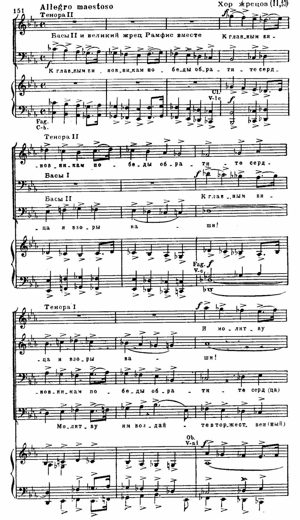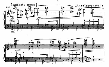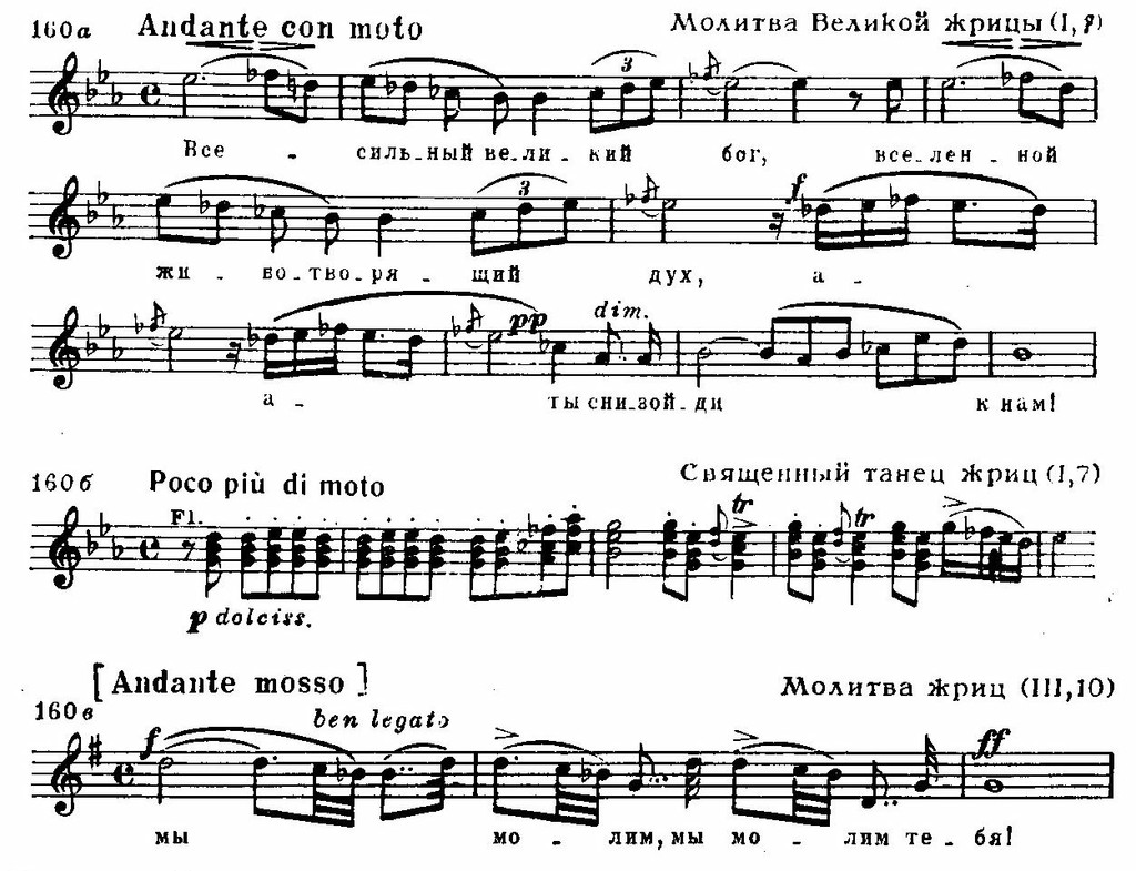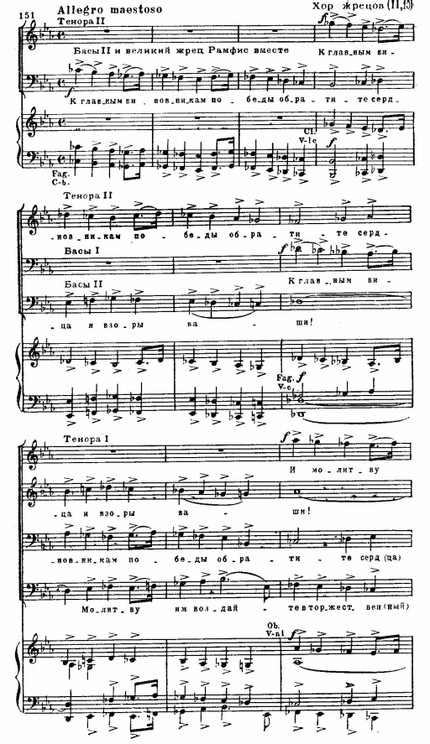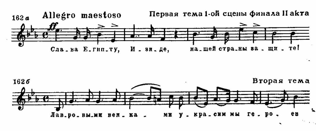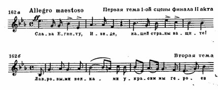 Первая сцена трехчастна. Вслед за торжественной славой на основе двух вариантно связанных тем следует грозное шествие жрецов (см. примеры 162 а, б и пример 151). В центре — победный марш и балет. Реприза несколько изменена благодаря контрапунктическому совмещению темы жрецов и второй темы славы: