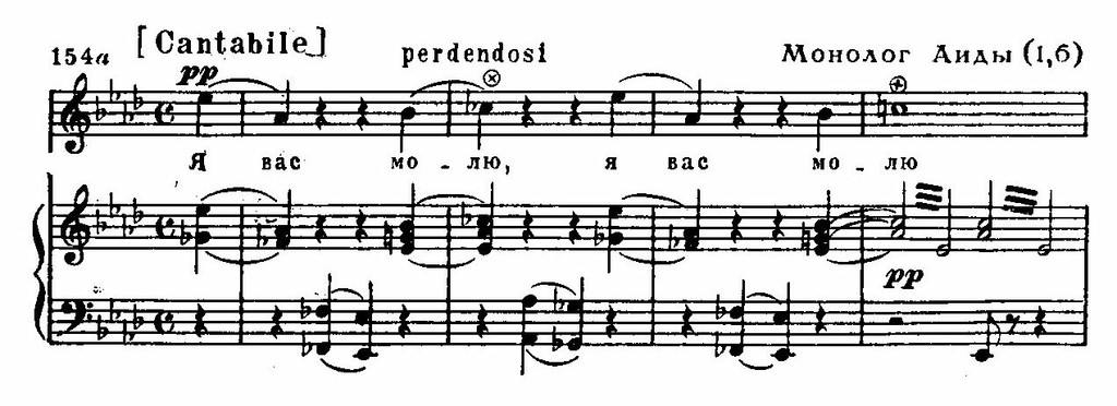В последнем дуэте в склепе Аида поёт «Прости, земля» очень тихо, словно сдерживая сильный внутренний порыв арии: протест её Верди смягчает, чтобы не мешать небесным вратам отвориться, как это должно быть даже и в «несчастливой» сказке.