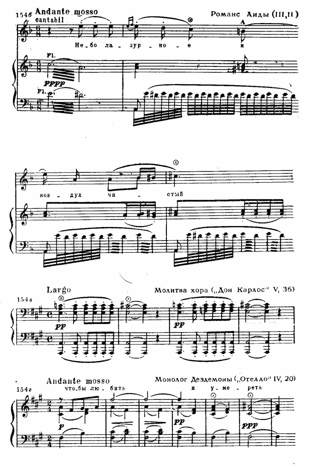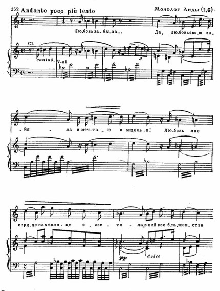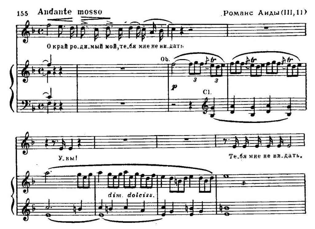 Если монолог драматичен и потому декламационен по музыке, то романс Аиды на берегу Нила (в III акте) имеет песенный склад. И композиция его проще: представляет собой две варьированные строфы, обрамленные полным поэзии свирельным наигрышем гобоя: