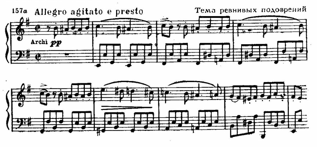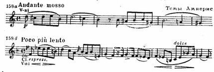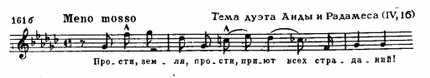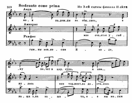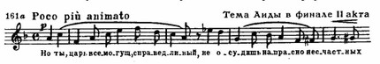 Этот богатый содержанием образ наделяется трагическими чертами в сцене суда (1-я картина IV акта): трижды повышается в тесситуре (а—b—h) мелодия жрецов, вместе с Рамфисом допрашивающих безмолвствующего Радамеса — грозный возглас тромбонов и зловещий гул литавр сопровождает допрос — и трижды повышаются интонации возгласов рыдающей Амнерис (см. пример 159 б) — это одно из потрясающих мест в опере!