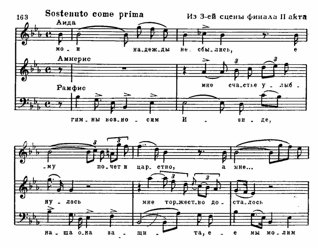 Как видно из этого схематического изложения, трижды как бы тень ложится на высказывания Аиды: в решающие моменты поединка в общую последовательность мажорных ладов (F-dur — B-dur — F-dur — As-dur) — врываются лады минорные (b-moll — f-moll — as- moll). И мерцанием As-dur — as-moll заканчивается молитва пленницы.