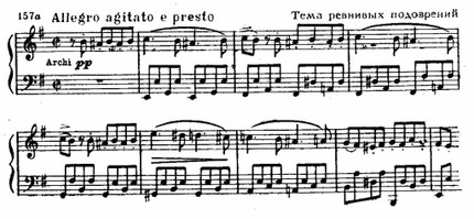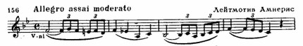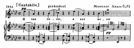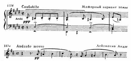 Но это лишь внешняя сторона образа — его внутреннее содержание раскрывается во многих разнообразных высказываниях Амнерис. Лейтмотивное значение преобретает следующий оборот — на его развитии основана первая сцена встречи Амнерис с Радамесом (1-я картина). Этот оборот неизменно возникает — не только в устах Амнерис,— когда речь идет о ее ревнивых чувствах по отношению к сопернице. Очевидно, не случайно в мелодических контурах темы обнаруживается сходство с начальным зерном лейтмотива Аиды.