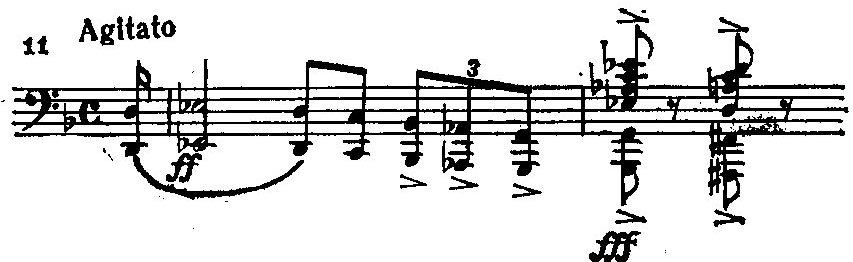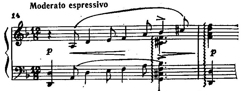 Этот оборот, зачатки которого мы встречаем уже в самых ранних юношеских произведениях Рахманинова (например, некоторые из неопубликованных автором романсов, отдельные моменты в симфонической позме «Князь Ростислав»), принадлежит к наиболее излюбленным композитором гармоническим приемам и настолько часто встречается в его сочинениях, что получил наименование «рахманиновской гармонии». Аккорд, предшествующий тоническому трезвучию, объясняется как уменьшенный вводный септаккорд гармонического минора с заменой терции квартой (в данном примере он представлен в виде терцквартаккорда) (В некоторых случаях аналогичный по звучанию аккорд может рассматриваться как минорное трезвучие на VI ступени с добавленной секстой. Оба варианта применяются преимущественно в миноре.). Выразительная острота приведенного оборота усиливается мелодическим ходом верхнего голоса от вводного тона не к тонике, а к терции лада, благодаря чему возникает напряженно звучащий неустойчивый интервал уменьшенной кварты.