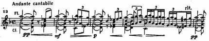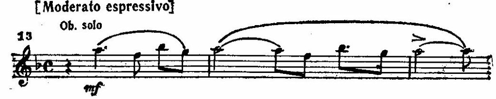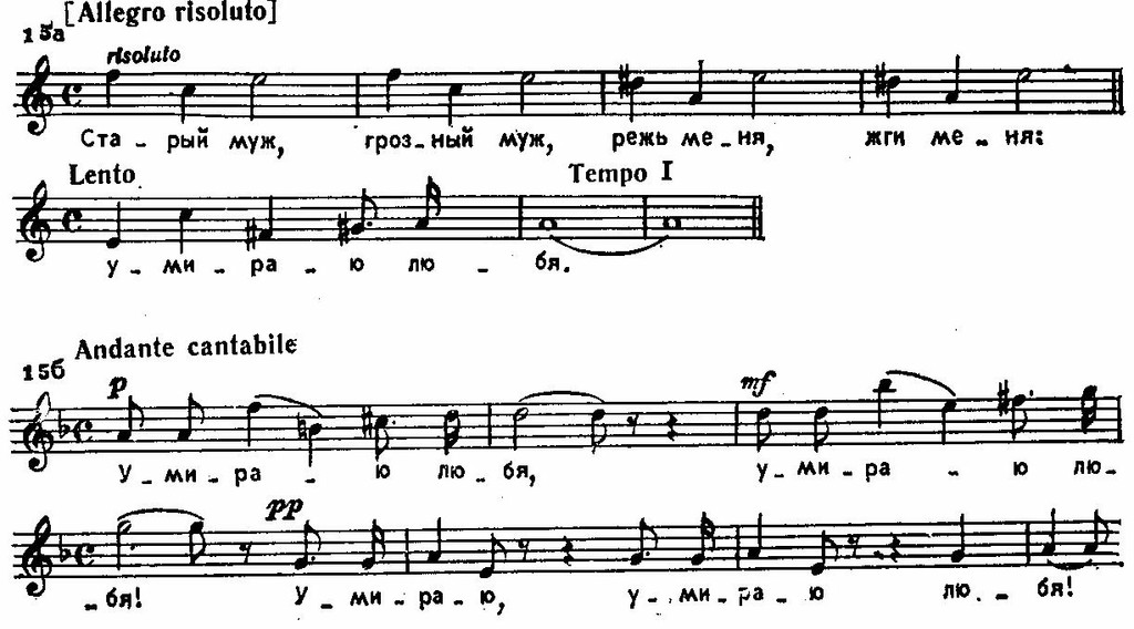 Вступительные фразы рассказа, сопровождаемые мерными аккордами арфы, вызывают в памяти величавую фигуру Баяна из «Руслана и Людмилы» Глинки. Но уже в конце этого вступительного построения происходит смена мажора одноименным минором и у гобоя нежно звучит фраза, которую можно охарактеризовать как мотив скорбного воспоминания: