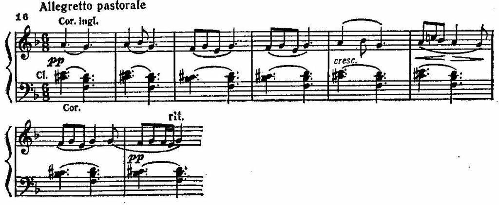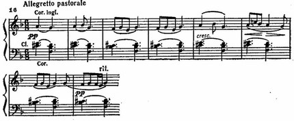 Впечатление тональной зыбкости усугубляется во втором проведении той же темы, где отчетливо дифференцированы две звуковые плоскости. В верхней плоскости ритмично чередуются трезвучия V и IV ступеней d-moll, в то время как бас равномерно покачивается на звуках b и f.