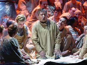 Сусанин Сергея Алексашкина появился на авансцене еще во время увертюры с рубанком и молотком, снимая стружку с новенькой доски. Явная и очень вагнеровская ссылка на Ганса Сакса из "Нюрнбергских майстерзингеров" словно намекала на то, что глинковский Сусанин не просто крестьянин, а поэт-провозвестник национального искусства. Но эта мысль так и осталась брошенной вскользь цитатой.