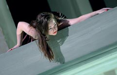 Кроме Тита и его верного стража Публио, никто больше в этом спектакле не надевал ничего старинного. Да и вообще костюмы «играли» только у коварной и амбициозной Вителлии, которая постоянно хотела соответствовать изменчивой ситуации и, чуть что, сбрасывала с себя неподходящее по цвету платье, оставаясь в роскошном неглиже. С фигурой у Доротеи Решманн все в порядке, а вот голоса могло быть и побольше.