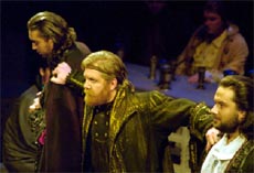 Что касается собственно пения, то, как в любом учебном процессе, были здесь и свои отличники, и середнячки, и аутсайдеры. Хочется отметить, что в центре внимательно работают над словом, и дикция почти всех певцов была на редкость ясной. Школа Вишневской явно пошла на пользу, по меньшей мере, двум студийцам, слышанным в прошлогоднем "Руслане": бас Романа Дерзаева (Малюта Скуратов) стал ещё глубже и значительней, а плотный тенор Павла Паремузова (Бомелий) не потеряв своих изначальных качеств, приобрёл интонационную точность. Хорош и Собакин Романа Астахова - несмотря на молодость, артисту удалось показать убедительный образ сначала степенного главы семейства, а затем несчастного отца. Александру Касьянову и по темпераменту, и по внешней фактуре вполне пришёлся впору образ буйного опричника Григория Грязного, причём певец смог счастливо избежать как нажима и фальшивых страстей в актёрском плане, так и форсажа в крайне тяжёлой вокальной партии - роль была сыграна и спета вполне свободно и естественно. Несколько разочаровала Ирина Окнина в титульной партии - образ получился довольно-таки вымученный, как будто Марфа больна уже изначально, а работы собственно над вокалом ещё непочатый край - певица отнюдь не всегда была интонационно корректна, резкие ноты встречались не раз, а к концу вечера ей откровенно не хватало дыхания, отчего финальную арию она еле дотянула, дробя бесподобную корсаковскую кантилену на мельчайшие фразочки. Ещё слабее показались исполнительницы небольших женских партий Наталья Левитина (Домна Сабурова) и Кира Смирнова (Петровна) - вокал просто сырой, а сценическая игра (точнее переигрывание) Левитиной местами откровенно напоминала дешёвый фарс. Значительно лучше пела Татьяна Метлина (Дуняша) - стабильная и в сольных эпизодах, и в ансамблях. Валентин Суходолец в вокальном плане был вполне приемлемым Лыковым, однако в арии третьего акта вдруг стал настойчиво демонстрировать неприятный носовой призвук.