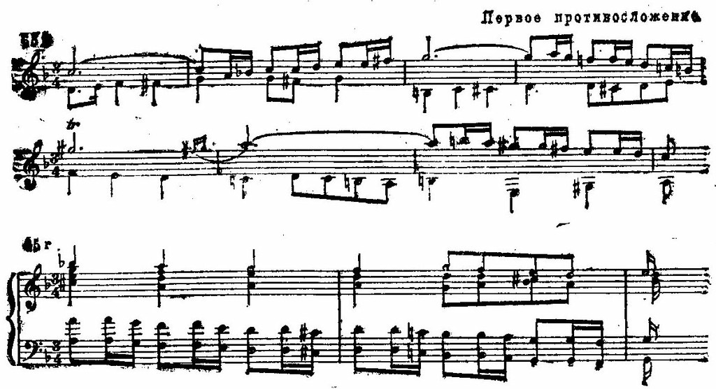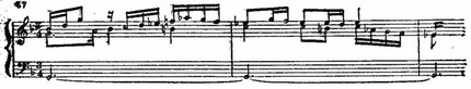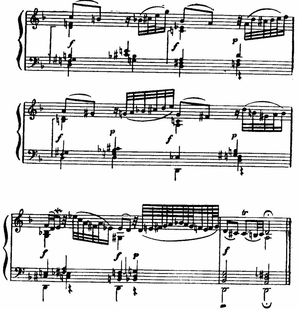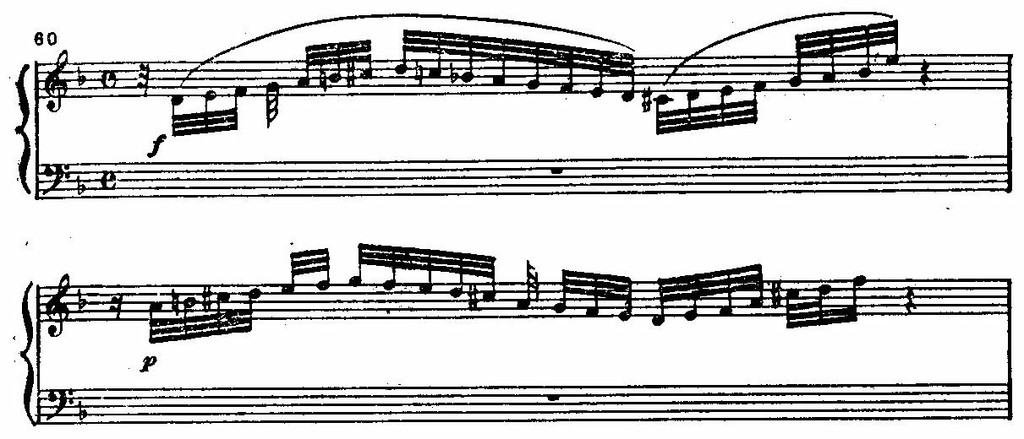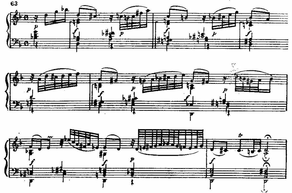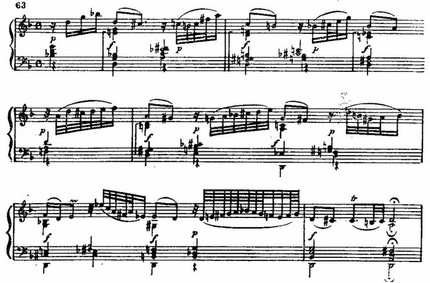 Наэлектризованность этого краткого вступления образует сильнейший импульс к дальнейшему драматическому развитию. Необычайна множественность выразительных средств: широта охватываемого диапазона, «бесконечные» изгибы фактуры, повороты движущихся линий, то поднимающихся в поступенных секвенциях с перекличкой контрапунктирующих голосов, которые тормозят движение, обыгрывая звуки неустойчивых гармоний, то длительно спускающихся. На протяжении значительного отрезка времени в этой непрестанной смене спусков и подъемов происходит интенсивное нагнетание, продвижение к первой кульминации. Именно здесь особенно явственно проступает драматический характер виртуозного начала.