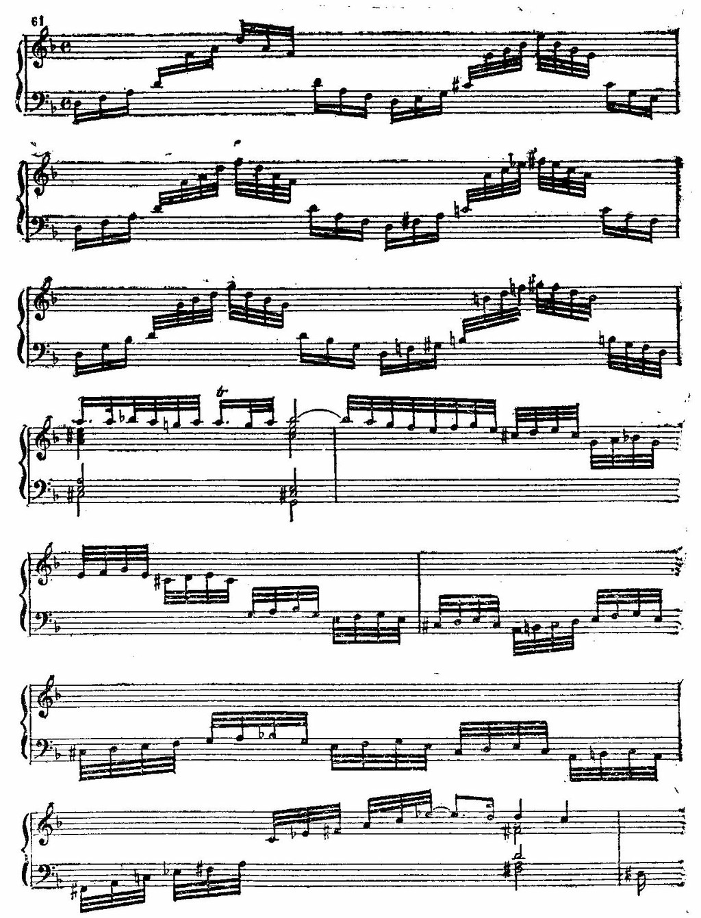 Здесь синтезированы самые различные типы фактуры не только клавирной, но и органной, скрипичной: гаммообразные пассажи, ломаные аккорды, гармонические фигурациии. Речитативные же эпизоды генетически связаны с оперно-ораториальной декламацией. Виртуозность, богатство и разнообразие фактуры, сопоставление различных ее типов создают рельеф крупного композиционного плана, выявляют опорные его узлы.