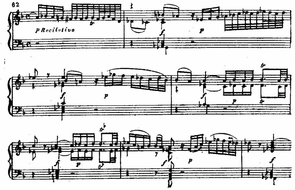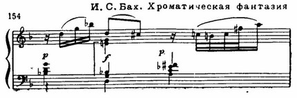 Однако «антифонность» соль-минорной фантазии, «соборность» самого органного звучания приводят к несколько иному результату. В клавирной «Хроматической фантазии» это самоуглубленное личностное высказывание, не столько диалог, сколько внутренний монолог, «разговор с самим собой». Философское и вместе с тем до предела эмоционально-напряженное размышление о смысле жизни — это содержание, угадываемое в речитативе фантазии, — позволяет протянуть нить от Баха к Бетховену, к знаменитому «гамлетовскому» речитативу в сонате ре минор № 17. Сложность самой мысли, внутренняя суть этого трагического образа требуют длительного и развернутого раскрытия. Каждая новая фраза приносит все большее напряжение; усложняется гармоническая опора, вводятся доминанты далеких тональностей (ре-бемоль мажора, си-бемоль минора, ля-бемоль мажора, фа-диез минора), альтерированные аккорды субдоминантовой группы. В речитатив проникают пассажные фразы, а пассажи насыщаются речитативными драматически-декламационными интонациями. Эта патетическая импровизация идет на едином дыхании, и момент максимального эмоционального сгущения совпадает с началом коды.