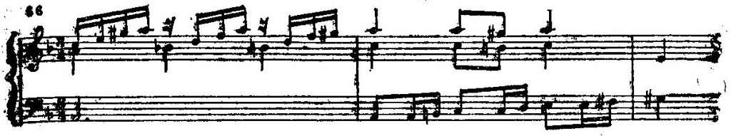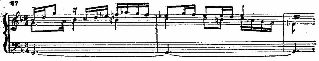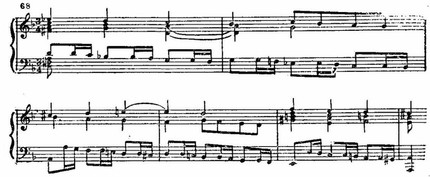 Особенно драматичен регистровый контраст двух последних проведений. В нижнем голосе тема опускается в глубокий басовый регистр, в верхнем — поднимается до крайних звуков второй октавы, напряженная пронзительность которых подчеркнута далеко отставленным доминантовым басом (органный пункт). И здесь уже в третий раз появляется нонаккорд (внутри темы) как знамение неизбежного конца.