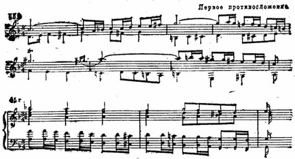 Так внутри темы ясно обозначается противопоставление тесно сопряженных вводнотоновых тяготений и песенной диатоники. Два столь различных интонационных пласта темы предопределяют их будущую образную отъединенность, но вместе с тем непрестанное взаимодействие (Следует обратить внимание на структуру темы, достаточно редкую в произведениях полифонического склада. Она предстает как функционально и структурно завершенный период (2 + 2 + 4), что несомненно обусловлено сложной образностью темы.). В теме же коренятся некоторые элементы, из которых формируется новый значительный, весомый музыкальный образ. Из ритмического дробления при опевании гармонически устойчивых звуков берет начало небольшая кодетта, за нее «зацепляется» первое противосложение. Поначалу несколько отвлеченный, нейтральный мотив противосложения, сохраняющий остинатный ритмический рисунок на протяжении всей фуги, внедряется затем во второе противосложение, пронизывает все интермедии. В процессе продвижения к концу он обретает властность, непреклонность, которые с особой яркостью и мощью проявляются в заключительном разделе фуги: