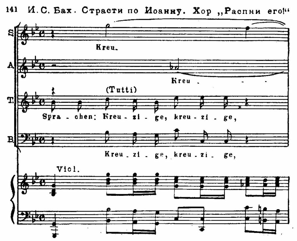 «Страсти по Иоанну» — произведение более раннее, не раз подвергавшееся переделкам, — менее совершенно и органично по воплощению темы. В нем еще сильны связи с традициями старого пассиона, доминирует эпический склад, количественно преобладают речитативы, хоралы. Партитура инструментована в старинном стиле. Архитектоника большой композиции производит впечатление диспропорциональной: первая часть слишком мала, чтобы уравновесить широко разросшуюся вторую (сорок восемь номеров из шестидесяти восьми), но и непомерно масштабна (двадцать номеров) для пролога трагедии. Зато в музыке заключено много дивных красот. Хоровой цикл в начале второй части с огромным размахом, силой художественной правды и динамики развития воплощает сложный образ обманутой и ослепленной толпы: