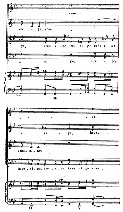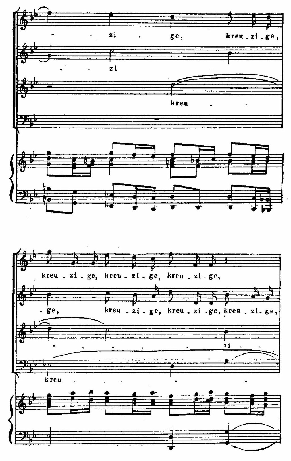 Эпизод Голгофы и крестной смерти героя решен в плане «глубинной», скромно затененной кульминации. Его окружение составляют элегические арии-плачи (Pieta), вызывающе-бравурный хор поругания, знаменитое «Порицание Голгофе» с колокольным аккомпанементом и большой внутренней силы речитатив евангелиста (тенор), в напевно-декламационной манере ведущего горестное повествование. В оркестровой звукописи запечатлена картина землетрясения. Потом наступает спад кульминации: у креста являются женщины, среди них покаявшаяся Магдалина, Иосиф Аримафейский... Чей-то бас (то ли Иосиф, то ли голос из народа) запевает вдохновенную похвалу наступающим сумеркам. Заключительная сцена Пассиона — «положение во гроб» — выдержана в том эмоциональном характере тихой и ясной скорби, какая была и осталась традицией немецкого творчества на эту тему — от Матиаса Грюневальда и до Пауля Хиндемита включительно. Завершающий композицию надгробный хор гомофонного склада — поэтическая элегия или эпитафия в c-moll на весьма непритязательные стихи. Мелодия насыщена вздыхающими интонациями, плавное скольжение параллельных терций и секст, баюкающий ритм сгущают ласковую атмосферу дремотно-светлого покоя. Кроткая и задушевно-общительная, эта песня явно обращена не к «богу-сыну», но к «человеку только — человеку, каких родит природа ежедневно». Именно здесь, к концу огромной религиозной эпопеи, все потустороннее, сверхчеловеческое окончательно преодолено и исчезает бесследно — не только в музыке, но и в последних словах либретто: