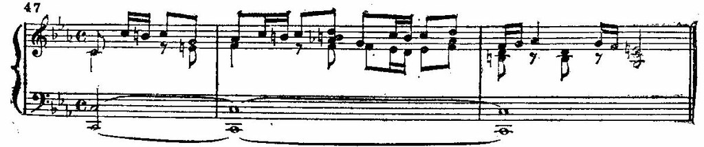 Фуга. Интонация вводнотонового опевания из заключительной фразы прелюдии становится мелодическим зерном темы фуги. Однако в сочетании с другими «строительными» элементами эта интонация утрачивает свой ламентозный оттенок, подчиняясь новому окружению.