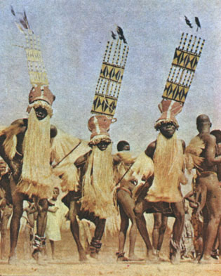В силу своеобразия историч. судеб Африканского континента проф. танц. иск-во африканских народов возникло сравнительно недавно и до 20 в. было ограничено областью фольклора. Первые сведения об А. т. дают наскальные рисунки (т. н. петроглифы) в горных массивах Сахары (8 — 6-е тыс. до н. э.). О роли танца в жизни африканцев свидетельствует наскальная живопись бушменов (Юж. Африка). Изображение фантастич. существ и пляшущих людей в звериных шкурах с рогами и в масках слона или антилопы указывают на связь танца с мифо-логич. представлениями африканцев. Найденные в районе озера Чад терракотовые статуэтки, названные «замаскированными танцовщиками», причудливо сочетают черты человеческих фигур с головами животных, что указывает на наличие масок как непременного атрибута танца. А. т. складывался на протяжении мн. веков — это синтетич. жанр, яркий сплав звуков, красок и движений, полный смысла для африканца, умеющего его «прочитать». Его осн. ритмич. рисунок связан с ритмикой ударных инструментов, прежде всего «говорящих барабанов» тамтамов. Танец сопровождается хоровым пением, часто и аккомпанементом на духовых инструментах — охотничьих рогах, тростниковых флейтах, окаринах, трубах из слоновых бивней и древесных стволов. Красочность и выразительность танца подчёркивается использованием масок — ритуальных, культовых, игровых и др. (иногда весом до 6 — 8 кг), яркого грима, татуировки, а также костюмов, ходуль, колокольчиков, разл. украшений (браслетов, перьев и др.), оружия.