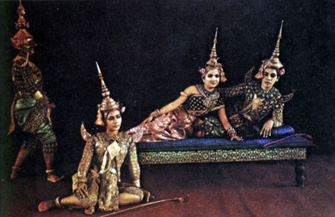 Декорации не применяются. Во главе труппы Нац. балета (свыше 50 танцовщиц) — 2 балетмейстера-танцовщика и 3 танцовщицы. Сценой для представлений (сопровождаются нац. классич. оркестром) обычно служат открытая площадь перед храмами Ангкора либо дворец в Пномпене.