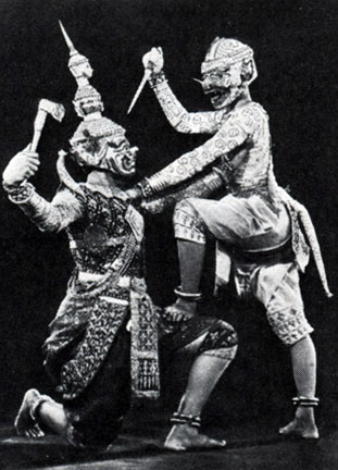 Единственная проф. труппа классического танца Кампучии — Национальный балет. До нач. 1950-х гг. в его состав наряду с женской входила мужская группа, исполнявшая драматич. пантомимы лакон-каул. Позже репертуар определяли представления, включавшие только женские танцы, лакон-каул ставится редко. В танц. драмах воскрешаются древние кхмерские мифы и сказания, оживают боги, короли, герои. Ставятся также эпизоды из индийских эпич. поэм («Рамаяны» и др.). Наиболее характерные позиции кампучийского танца: одна нога танцовщицы отведена назад и поднята, кончики большого и указательного пальцев руки соприкасаются, а остальные резко отогнуты; одна нога танцовщицы, вынесенная вперёд, резко пересекает другую ногу.