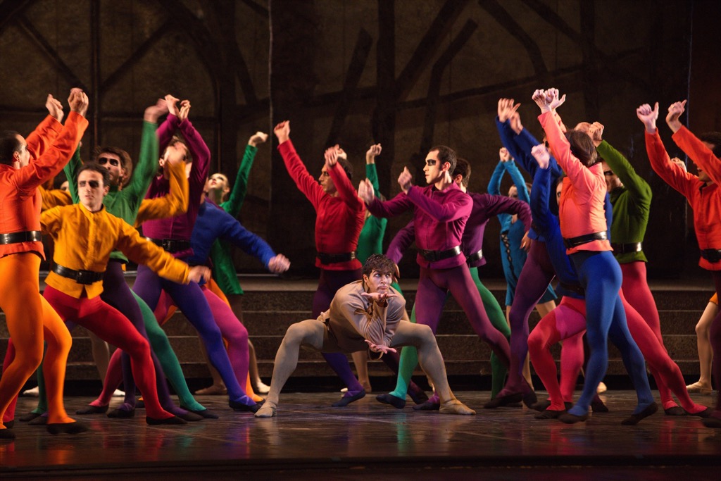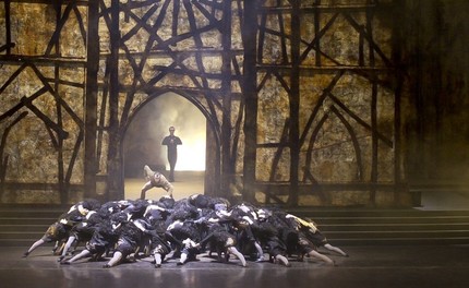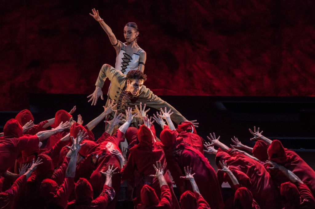В балете «Собор Парижской Богоматери» совершенная красота классического танца оттеняется острым гротеском, насыщенным современной пластикой. В этом монументальном трагическом спектакле также причудливо сочетается суровая реальность и мрачная фантазия. Так, в картине, где Эсмеральда убегает от Квазимодо, на ее пути возникают призраки — своеобразные двойники преследователя. Постепенно эти кроваво-красные двойники заполняют всю сцену, свиваясь в жутковатые клубки и гроздья. Сам Квазимодо с ужасом следит за этим скорбным «хором» то ли близких ему по духу калек, то ли фантомом его уязвленной души. Мрачным гиньолем выглядит и сцена в соборе, где Эсмеральде чудятся двойники Клода в черных одеждах, которые катят перед собой тело мертвого Феба. Впрочем, и реальность порой пугает не меньше, когда толпа жаждет зрелища казни невинной Эсмеральды. Так же как в оригинальной «Эсмеральде» в девятнадцатом веке был обязателен счастливый конец, так в спектакле сурового двадцатого века в живых остается лишь одинокий и несчастный калека Квазимодо.