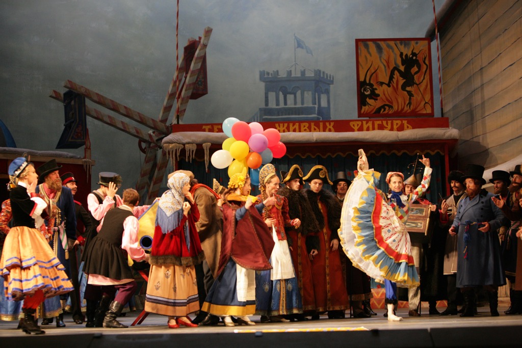 Бенуа-сценарист населил картины масленичного гулянья обилием персонажей, а Бенуа-художник одел их в театрально достоверные, нарядные костюмы, дополнив сцену еще и немалым числом деталей ушедшего быта: шарманкой, детской каруселью, перекидными качелями, дымящимся самоваром. Со временем, правда, в спектакле остались только предметы, необходимые для развития действия. Толпа, состоящая ранее из разнородных членов, каждый из которых действовал на свой лад, неизбежно скатывалась к коллективному импровизационному хаосу, оправдываемому всеобщим подпитием персонажей.