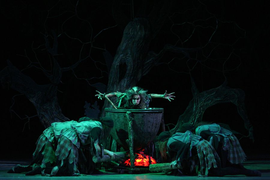 2. Лес, туман. Слева пещера в скале. Колдунья Медж готовится к шабашу, разводит огонь, чтобы сварить волшебное зелье. По ее знаку из пещеры появляются двадцать ведьм, а также обезьяны, совы, свиньи и прочее лесное зверье. Они беснуются вокруг котла, кидают туда жаб, ящериц, гадюк, козлиные уши и т. п. Когда зелье готово, Медж читает заклинания. Из котла вынимают разные предметы, себе Медж оставляет шарф. Поганый пляс длится до рассвета.