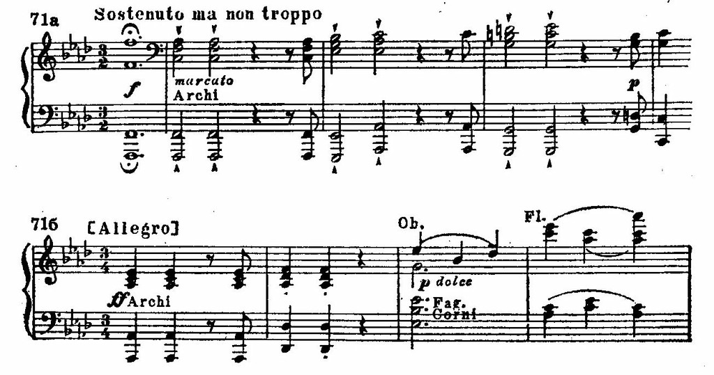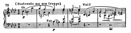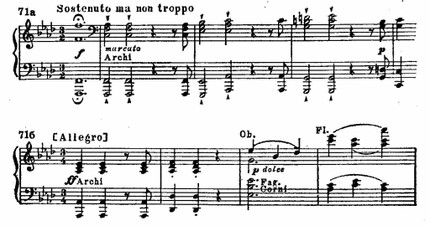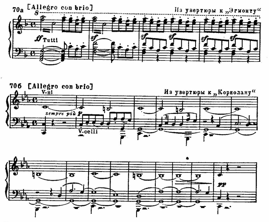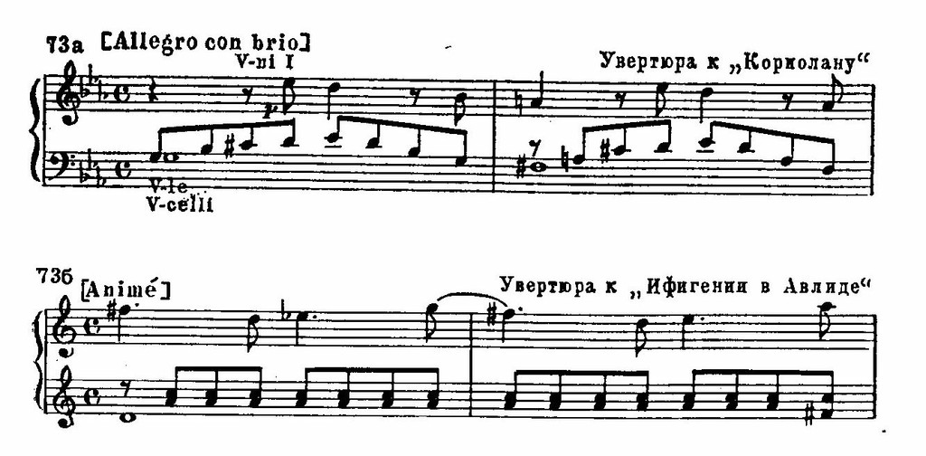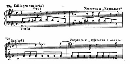 Точно так же трагические темы «Кориолана» впитали в себя характерные интонации скорби из оперных лирических трагедий. Можно сравнить, например, тему из «Кориолана» с темой страха и скорби из «Ифигении в Авлиде» Глюка: