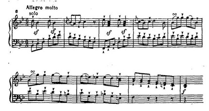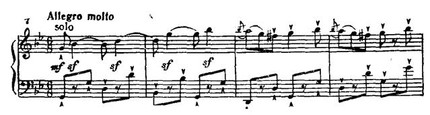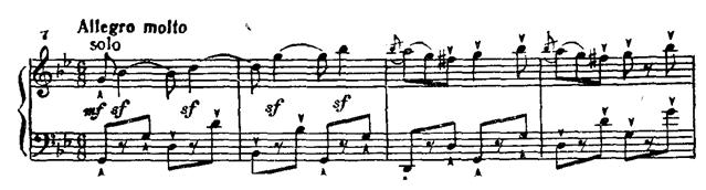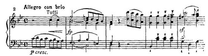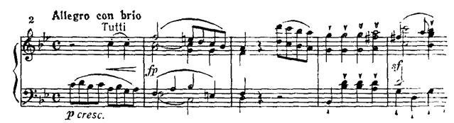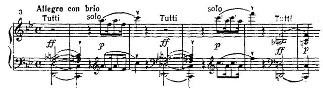 Далее по-бетховенски накапливается сила энергии, множатся sf на слабой доле такта. В момент кульминации мощные унисоны fortissimo на звуке до сдвигаются, хроматически повышаясь, на звук ре-бемоль pianissimo. Такой переход к побочной партии — это уже чисто бетховенский эффект внезапного тонального смещения, подчеркнутого резкой светотенью. (Ср. подготовку вступления солиста в разработке Первого концерта: модуляция G-dur — Es-dur, но с обратной динамикой — от pianissimo к fortissimo.)